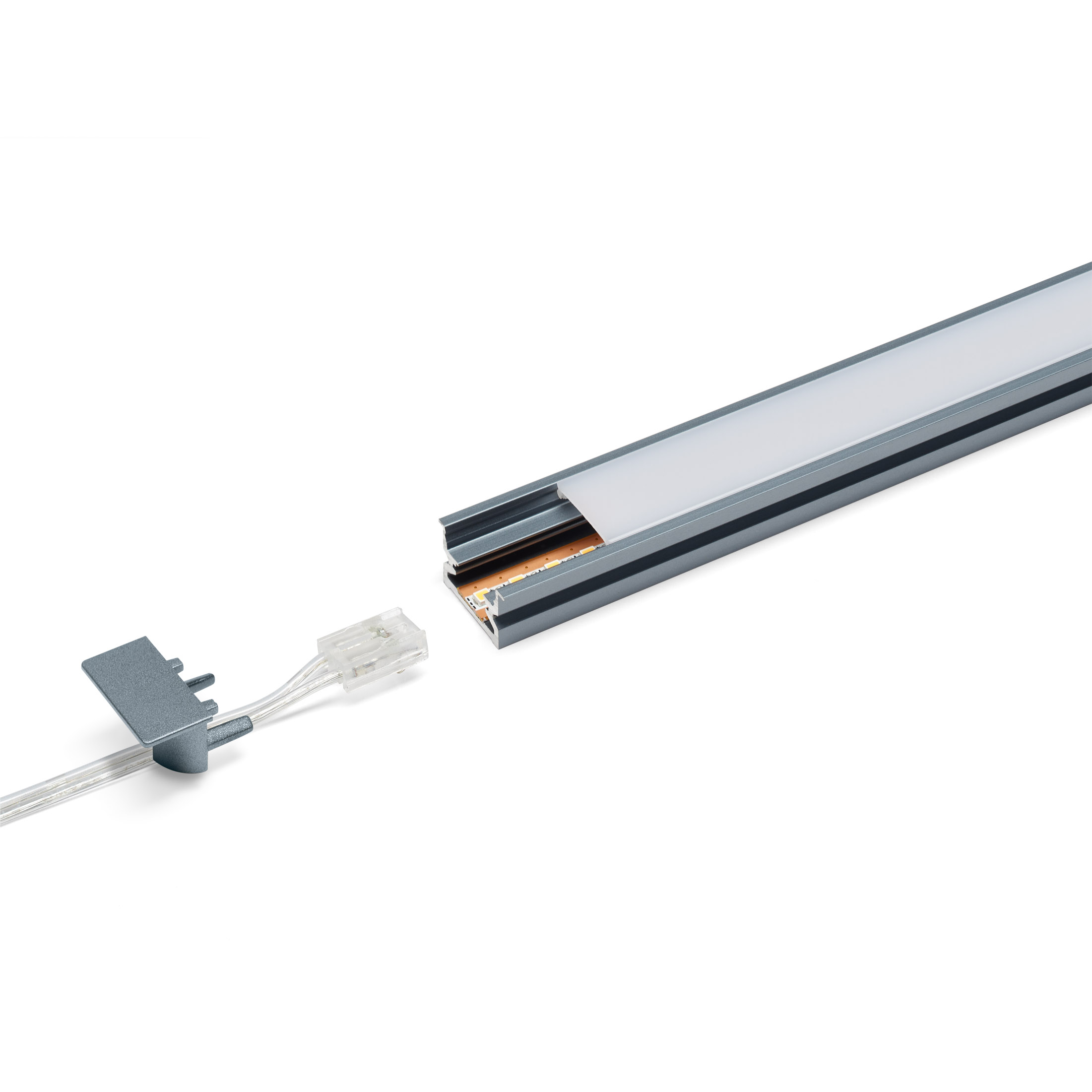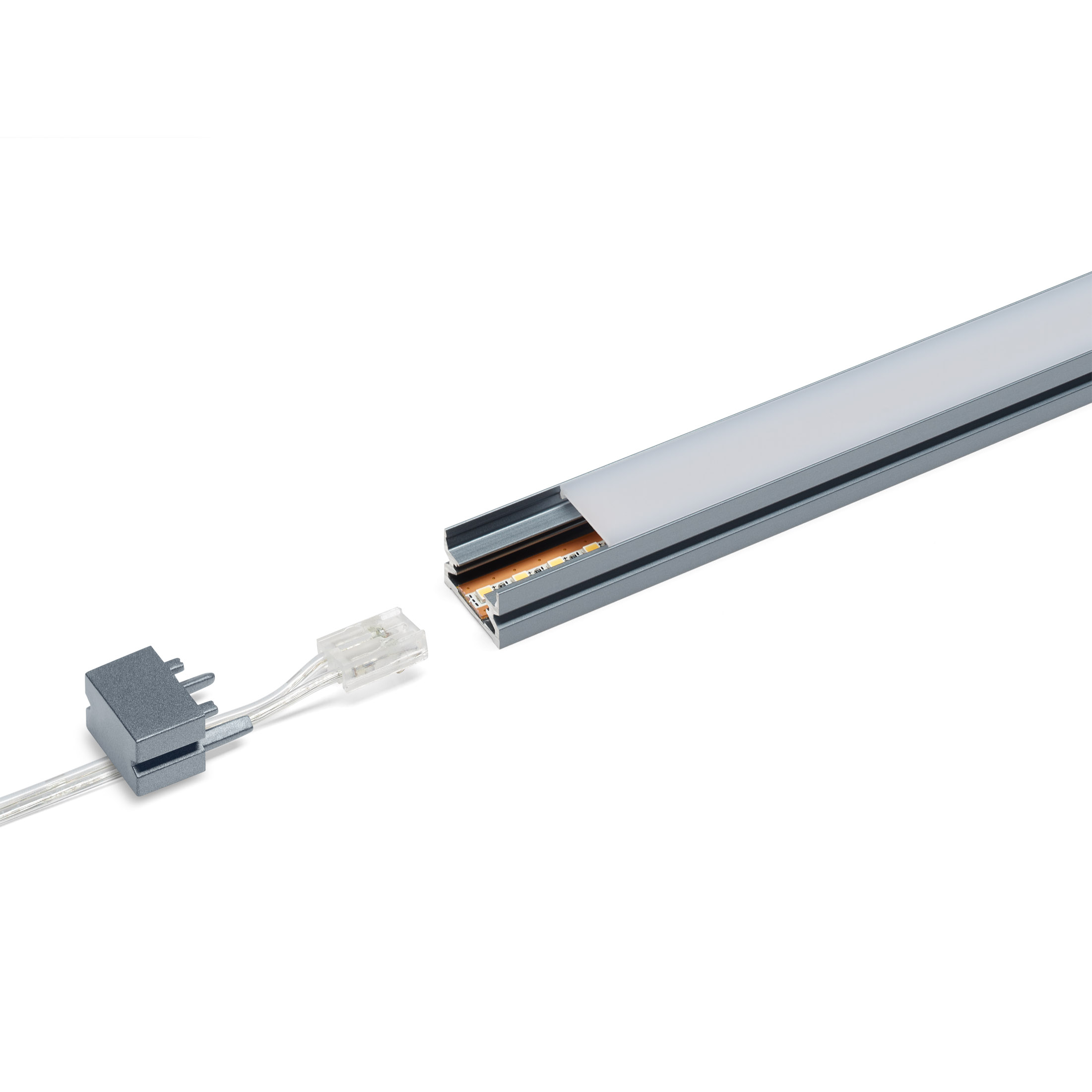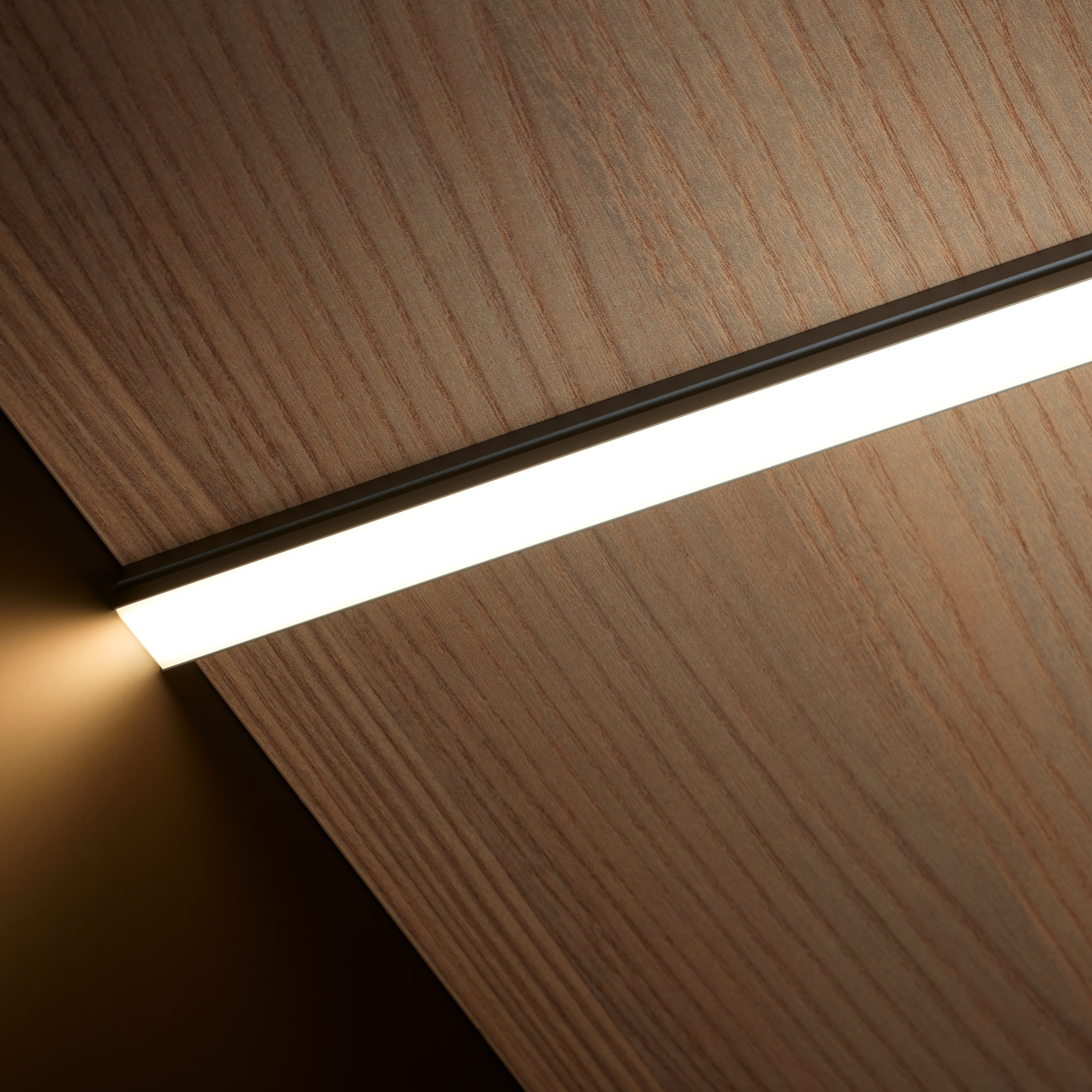 Magno, surface profile L219 with the option of being recessed depending on the cover used (L219CR) or recessed profile L219R, featuring high brightness and a dotless LED design, available in titanium color. It can integrate a touch sensor. Supplied in 2.5 m bars with LED strip and cover pre-assembled. Can be cut to the desired length. Recommended for countertop, display case, and cabinet lighting.