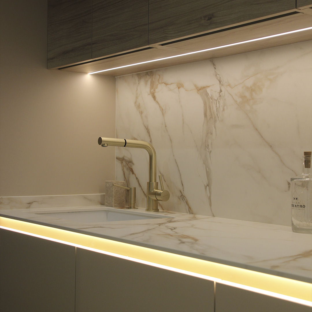 Illuminated profiles under the upper cabinets and LED strips in the work areas not only bring light to key areas, but also create a warm and welcoming atmosphere.