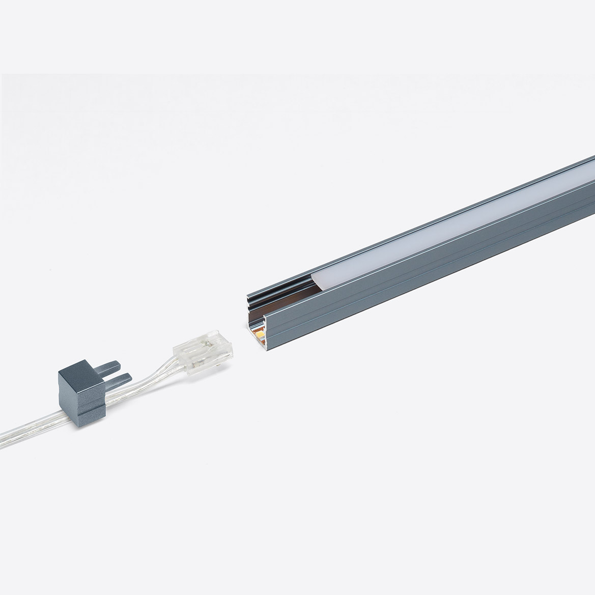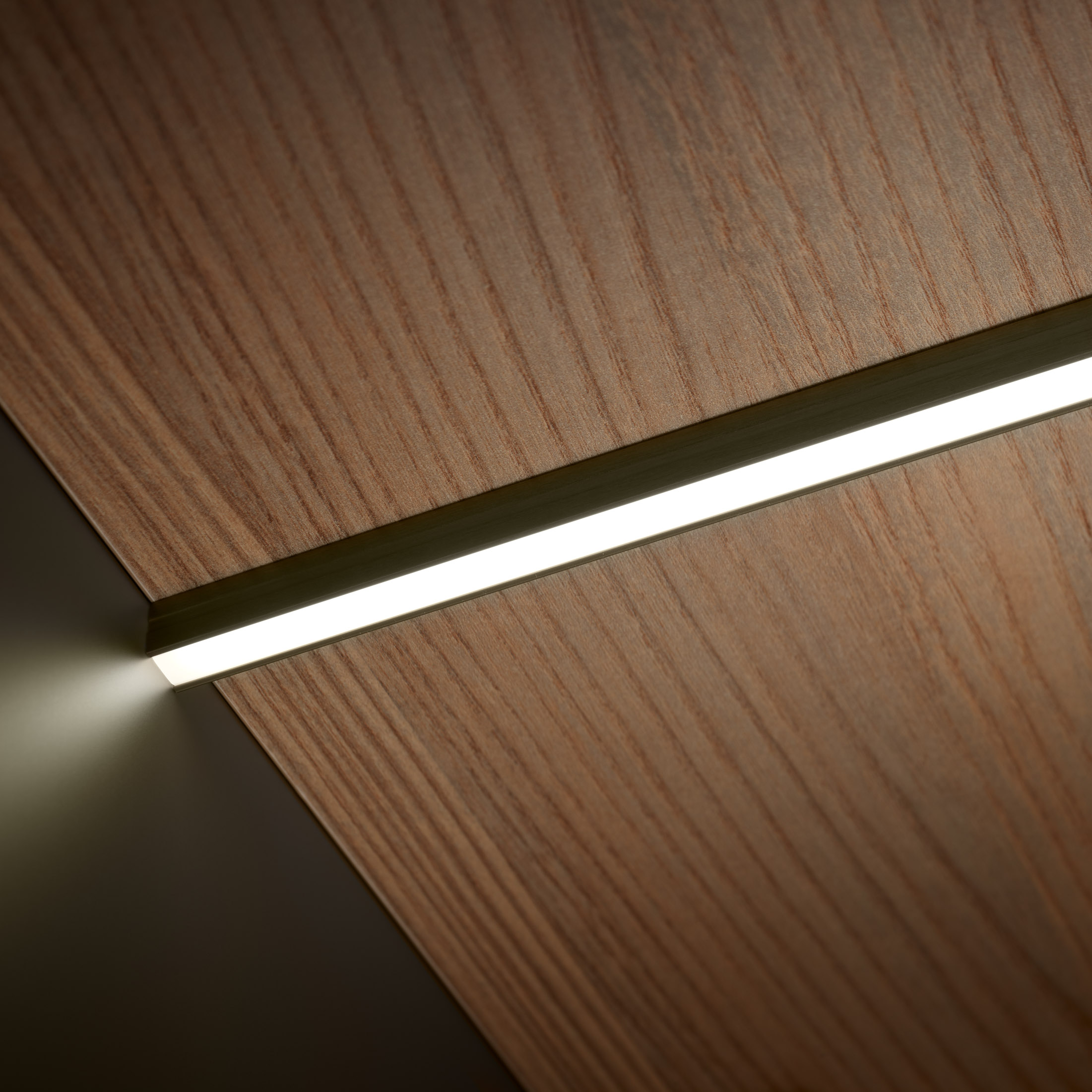 Vision, profilé de surface spécialement conçu pour les angles. Disponible en barres de 2,5 m en couleur gris-bleu ou bronze, fourni avec bande LED et couvercle monté. Possibilité de couper à la taille souhaitée et d’intégrer un capteur tactile on-off et dimmer. Recommandé pour l’éclairage des plans de travail.