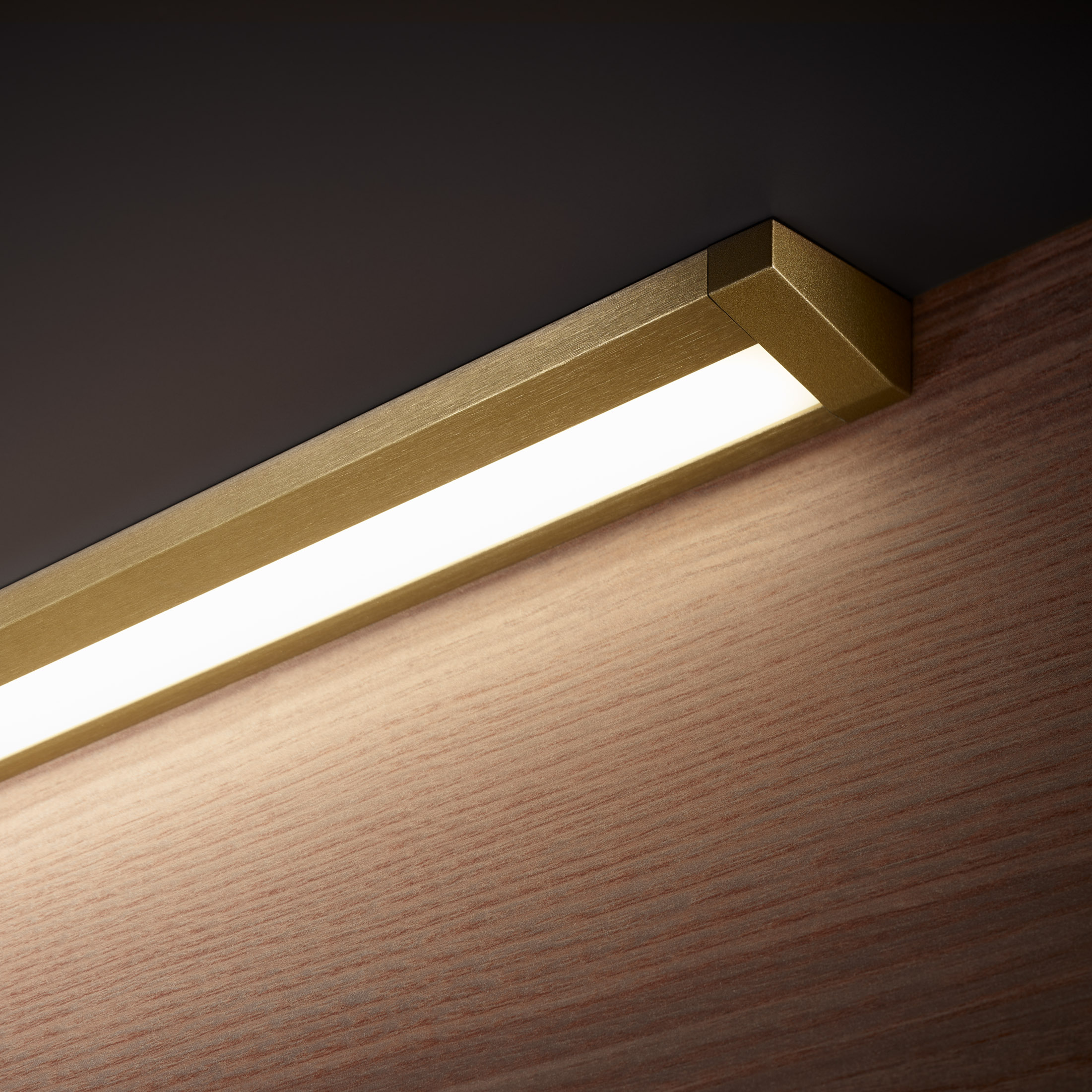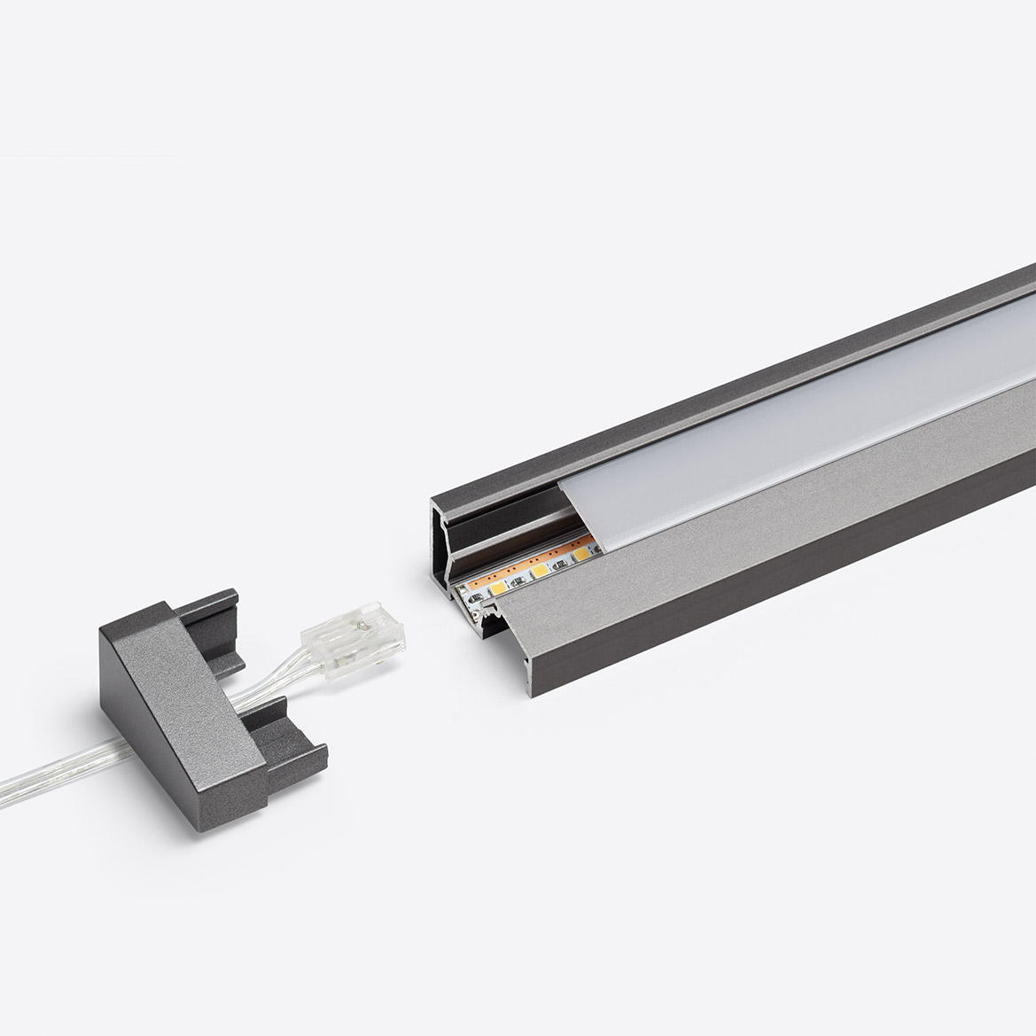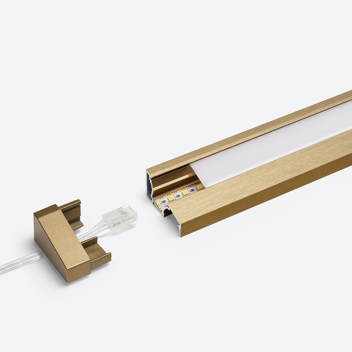 Vision, profilé de surface spécialement conçu pour les angles. Disponible en barres de 2,5 m en couleur titane ou bronze, fourni avec bande LED et couvercle monté. Possibilité de couper à la taille souhaitée et d’intégrer un capteur tactile on-off et dimmer. Recommandé pour l’éclairage des plans de travail.